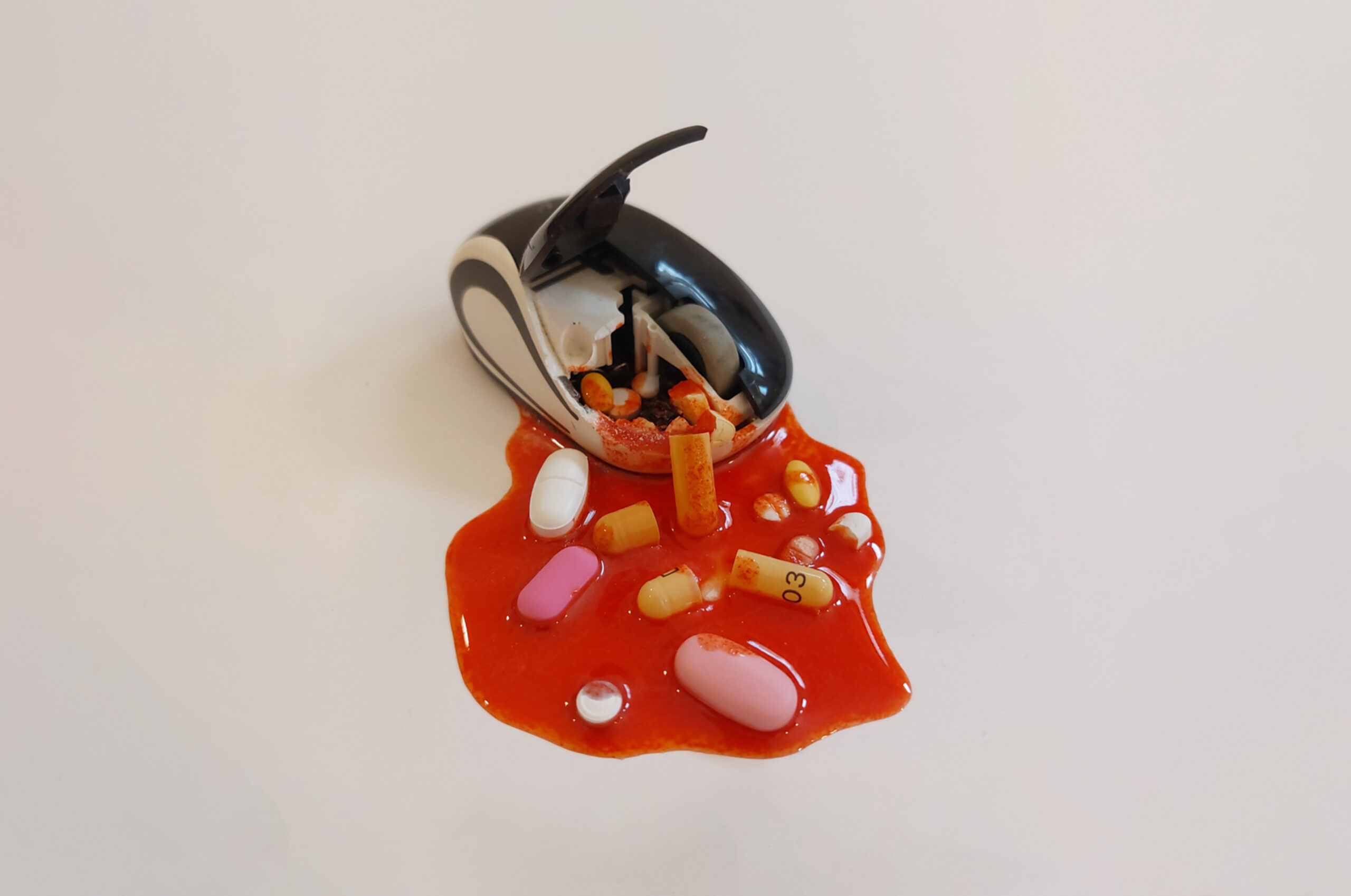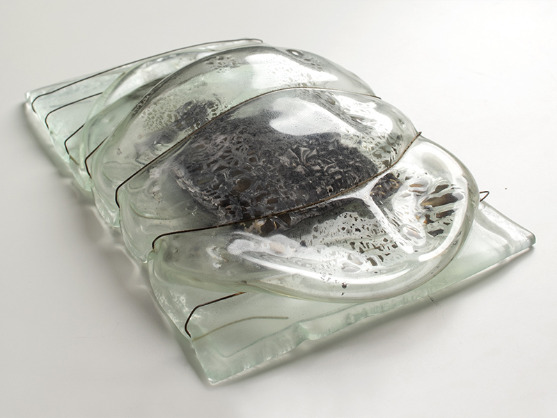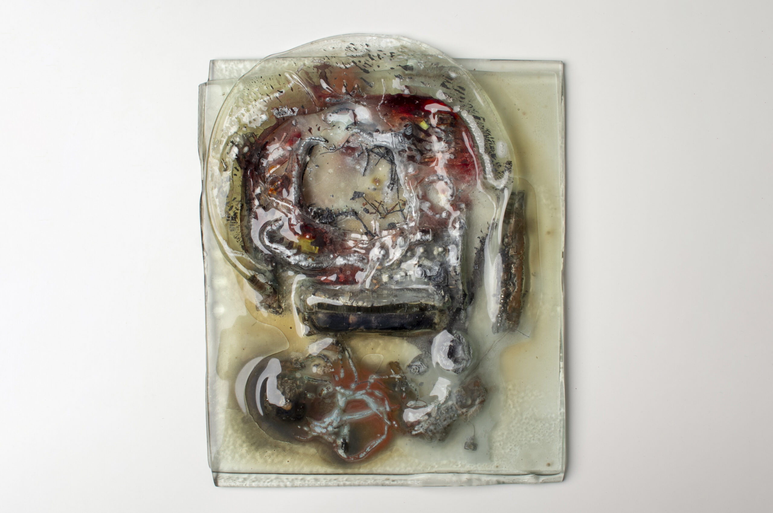 Yes! ¨Electroctopus Breathing #01¨ is one of the pieces of a series of glassworks, sculptural objects referencing underwater pollution. I developed the series by fusing glass with electronic waste in a kiln. The result resembled a jellyfish, immediately connecting to the idea of underwater pollution. Inside the glass bubble is a charred electronic board, resembling the belly of a beast trapping burned toxicity.