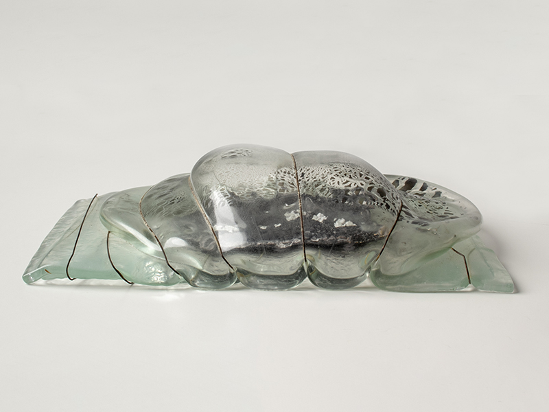 In “Electroctopus Breathing #01” (2021), Netto utilises discarded glass and electronic scrap to create a poignant commentary on the proliferation of electronic waste in our oceans. By fusing these materials into a singular, evocative object resembling a jellyfish, he reveals charred electronic debris encased within an air bubble seemingly on the brink of bursting, capturing the precarious threat to our marine ecosystem.